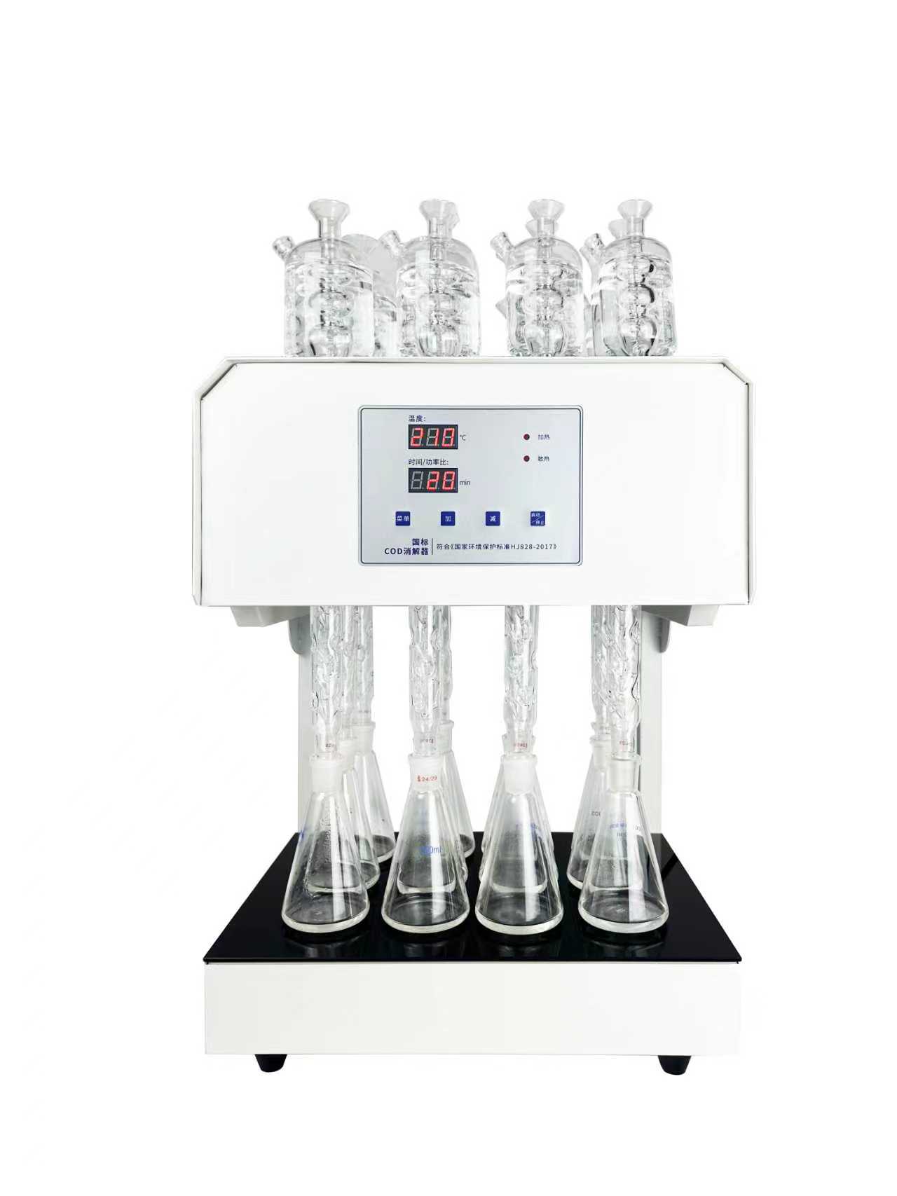 标准微晶COD消解器 采用进口微晶面板。面板为可耐800℃高温微晶板,板面发热均匀,升温、降温速度快。加热部分使用新型的进口耐高温陶瓷纤维发热盘,消解器的底板和周边的热损失小,受热、导热均匀,热效率更高。仪器主要由机身、回流管、风扇、微晶加热板等4大部分组成,采用微机PID技术进行定时控制加热电炉板和风扇,可对6个锥形瓶回流装置同时进行加热。仪器的化学溶液配制、操作和COD的计算完全遵照(HJ828-2017)重铬酸盐法,低于50mg/L的COD水样可通过稀释滴定剂和氧化剂来提高精确度,高于700mg/L的COD水样,可以通过水样的比例稀释来完成测定。